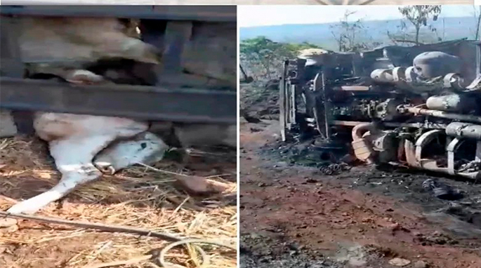 Carreta carregada de bois tomba e pega fogo no interior do Maranhão