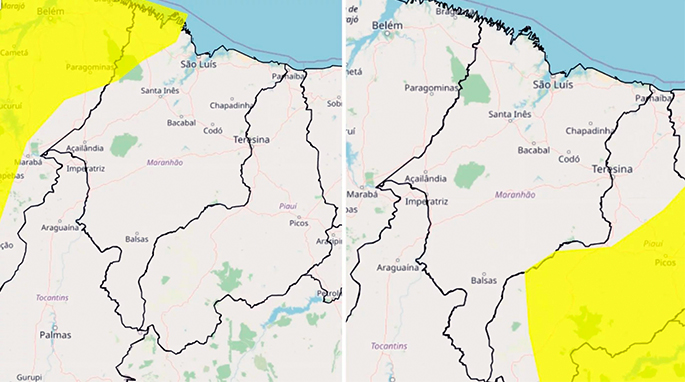 Segundo o órgão, o alerta de chuvas intensas atinge 23 municípios, com previsão de pancadas acompanhadas de vento e risco pontual de transtornos. Estão sob aviso as cidades de Amapá do Maranhão, Apicum-Açu, Bacuri, Boa Vista do Gurupi, Cândido Mendes, Carutapera, Centro do Guilherme, Centro Novo do Maranhão, Cururupu, Godofredo Viana, Governador Nunes Freire, Junco do Maranhão, Luís Domingues, Maracaçumé, Maranhãozinho, Mirinzal, Nova Olinda do Maranhão, Presidente Médici, Santa Helena, Santa Luzia do Paruá, Serrano do Maranhão, Turiaçu e Turilândia.