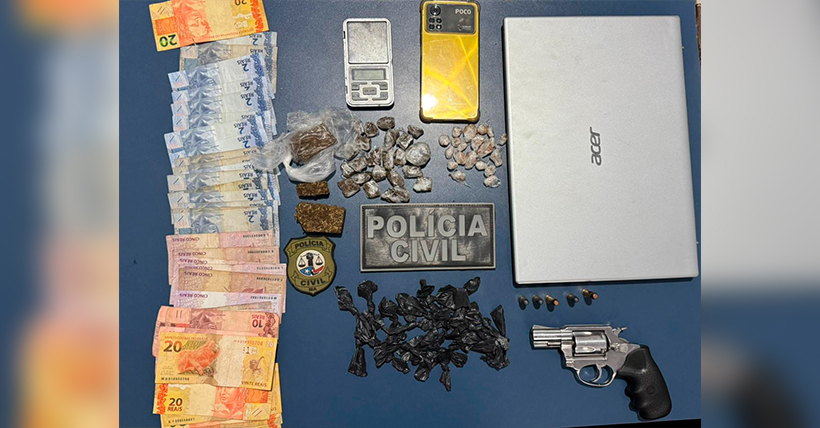 Durante o cumprimento do mandado de busca domiciliar na residência do alvo, os policiais civis apreenderam um revólver calibre .38, de uso permitido, municiado com cinco munições intactas, além de 39 pedras pequenas de crack, 20 porções pequenas e três porções médias de maconha, uma balança de precisão, um aparelho celular, dinheiro em espécie e um vasto acervo documental que pode contribuir para o aprofundamento das investigações sobre falsificação de documento público.